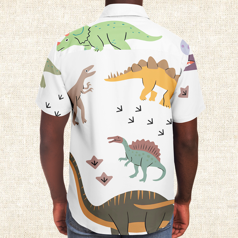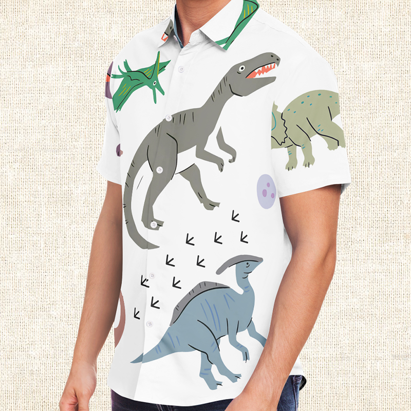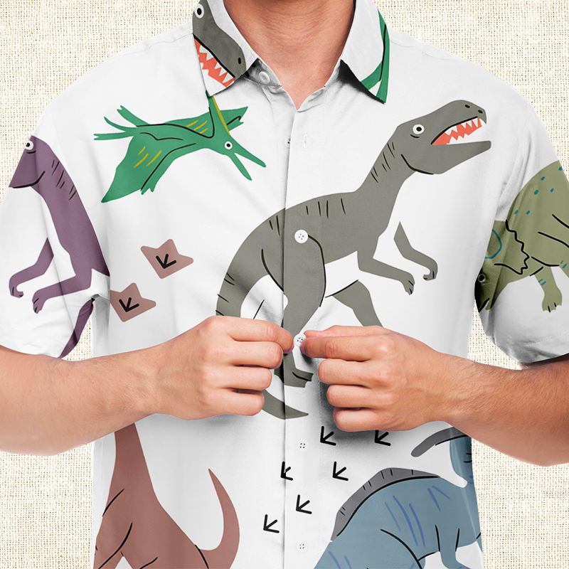 This fun Dinosaur button-up shirt is perfect for anyone who wants to add a little Rawrsomeness to their wardrobe. This shirt features a unique all-over-print illustration of majestic Dinosaurs in soft earthy colors. Ideal for everyday wearing and looking Rawrsome!